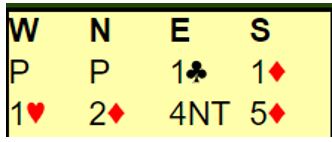 Det var forsåvidt en gunstig start for øst, makkeren fikk meldt hjerter billig - tilpasning funnet! Idet nord støttet ruteren gikk øst rett i 4NT - Key Card spørsmål. Men Marianne Homme på syds plass hadde ikke sagt sitt, hun sa 5 ruter. Hva betyr makker (vest) sine meldinger nå?