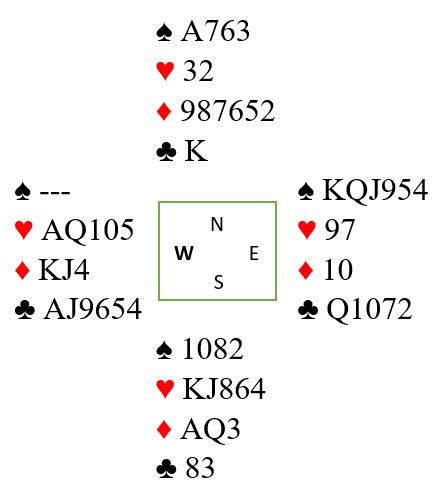 Lorenzini fikk ruter ut. Siden kløveren ordnet seg fikk han tretten stikk da spar 9 kunne kastes på den femte kløveren. I BAM kan det ekstra overstikket være gullkantet hvis N/S er kun i utgang ved det andre bordet og sparutspill blir funnet.