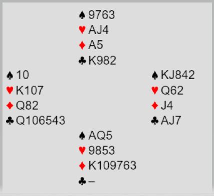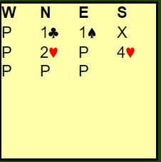 Kom Trondsen på banen med 2 spar- bud. Siden jeg hadde minimum valgte jeg å passe, men da kom Marthinussen inn med budet 3 ruter. Trondsen valgte å doble for å vise en to-farge hånd, jeg passet og det samme gjorde Arne.
