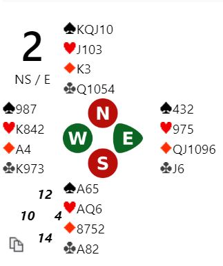 N/S har nesten verdier til utgang, 24 poeng til sammen. Og slik det sitter står det i 3NT. Merk at spar 9 er et viktig kort her, hvis ikke kan Ø/V få fatt i fire sparstikk og for hjerter ess, men med tieren og nieren i spar har N/S en stopper. Slik det sitter vinnes dermed 3NT hvis man kommer seg dit. Men ved de fleste bordene ble kontrakten 2 spar Ø/V! Det skjedde flere steder etter to passer og åpning med 1 ruter av øst. Noen steder åpnet nord med sin flate 11-poenger. Da går naturlig nok syd på til utgang.