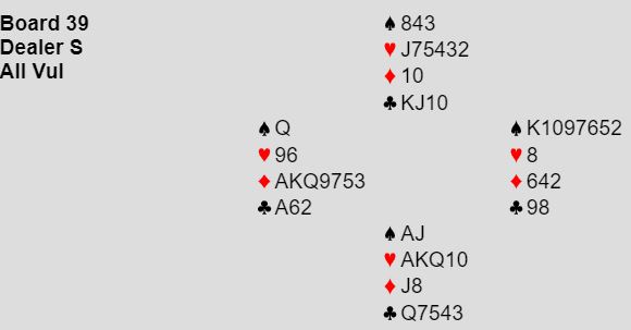 Tablå, 13 stikk rett ned og+440ntildem gaoss -2 mens serving rruter fra ru K ville gitt oss de to første stikkene! Det hadde blitt +4, altså mer ved å sattse på et HP har ru A som to par hadde gjort.