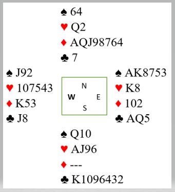 Sigud spilte nut liten kløver som gikktil K og ess. Jeg ville prøve å utnytte trumfen og spilte med en gang opp igjen sp 8,lavt fra Sigurd ogjeg valgte å stolepå at hen nda neppe hadde sp A, men 10-eren ble vunnet av sp D og mer spar spilt til ruter- avkast og sp A kos en dristig Vest. Kløver ble stjålet i bordet, ru A ognrun5 5tilnJ og røf fulgte før nokmen kløver blenstjålet. PånspK kommlitentrumf fra Øst, men jeg kunne stxjeleover og spille noknennkløver der Vest vant, Men med hjn KihosnSigurd endte det hele med -1 som ga oss -4 men hadde jeg brukt spK i stikk2 villejeg trolig fått hjem kontrekten ogmfått ren ropp,+ 5 i stedet. Feil igjen- og dyrt!
