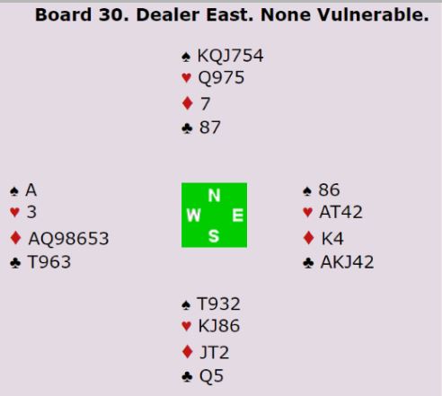 Om man skal være helt ærlig er 7 ruter litt vel hardt, men storslemmen har bra sjanser! Og å se at vests kort mot en 1NT åpning er slemkort er bra vurdert.