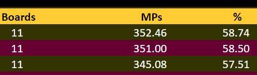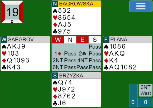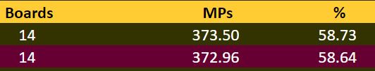 "Vårt» par var litt uheldig i det nest siste spillet da motparten spilte den normale utgangen. To par meldte nemlig slem og gikk bet, så det ble bare 33% for å spille mot en standard utgang. Hovedrivalen var i den utgangen og fikk 67%. Fattige 4,5 MP bak før det siste spillet.