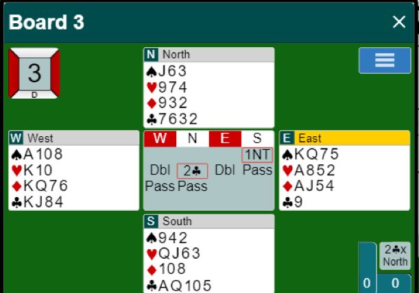 Vest spilte ut spar konge til esset. Så kom ruter fra nord. Med åpne kort ser man at 3NT kan betes. Da må øst gå på med honnør idet ruter spilles fra nord. Øst får i så fall to raske inntak i ruter og kan idet han kommer inn på det første ruterstikket skifte til kløver. Spillefører rekker ikke å få tak i mer enn 1+5+1+1 = 8 stikk. Men øst kan neppe kritiseres veldig for ikke å legge i stor ruter da det godt kan hjelpe spillefører til å løse ruteren best mulig for han. Og øst aner ikke så mye om hvordan resten av kortene ser ut. Så øst la liten ruter, og spillefører vant stikk for ruter 7. Med to ruterstikk i boks behøvde spillefører kun ett kløverstikk for å komme til ni stikk (1+5+2+1=9). Dermed ble det +600 til N/S ved det bordet som sammen med 140 ga 12 IMP ut for det norske laget.