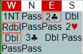 Nord strakk seg til en negativ dobling selv om det var så høyt som over 3 spar, en skummel melding da man "hater" å høre 3NT fra åpneren som jo må melde det selv med helt minimum. Og det skjedde, syd sa 3NT før det gikk pass rundt.