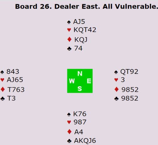 De fleste spilte utgang i hjerter eller grand. Noen veldig få par var i 6 hjerter og vant den. Det er imidlertid alt for hardt, og kløver ut fra syd beter slemmen. Om det kommer kløver ut rekker ikke spillefører å få spilt tre runder trumf før de fire sparstikkene må tas med avkast av kløver. Dessuten er det jo heldig at det er fire sparstikk, og i hjerterfargen må det også unngås to tapere.