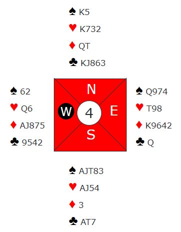 Som du ser vil en eventuell kløverfinesse mislykkes, og etter det vil det bli tipping i ruter, med ti stikk eller en bet som resultat.