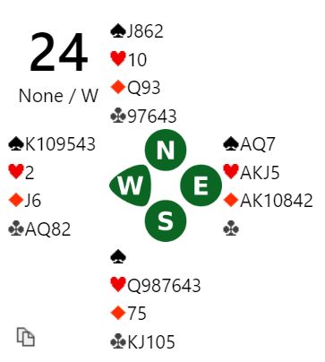 Der ruter dame kom i utspill ble kløver ess spilt med tanke om å prøve den andre sjansen om ikke kongen kom på. Siden kongen falt var det over, tolv stikk, DE BOTTON +1370.Spillet var verd 16 IMP for DE BOTTON.