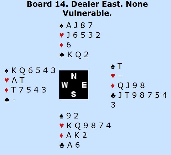 Øst trumfer hjerter ess i tredje stikk. Da er det ingen mulighet for å bli kvitt begge de to små hjerterne. Hvis du prøver å trumfe en av dem kan øst trumfe over og spille trumf så blir det ingen trumf igjen hos nord, og du blir hengende med en hjertertaper i tillegg til å ha gitt bort to trumfstikk og til kløver konge. Og øst kan også skifte til trumf etter at han trumfet hjerter ess. Du kan forsåvidt ta finessen, men med kun en spar igjen hos nord blir det to hjertertapere hvis du tar ut østs trumf, og hvis du forsøker å trumfe en av de to små hjerterne trumfer øst over. Da har de tre stikk allerede, og senere må du avgi ett hjerterstikk til vest - en bet.