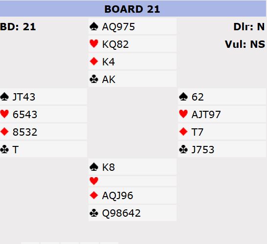 Det ble langt i fra noe vakkert meldingsforløp. Så det forbigås i stillhet, men til slutt, etter at syd hadde fått forsinket ruterstøtte hos makkeren tok han sjansen på 7 ruter. Det var ingen dårlig kontrakt om en ser bare på nord og syd sine kort: