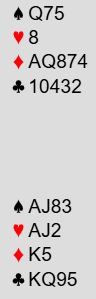 Ø/v har kun 14 HP til sammen. Det er den åtteren som gjør at det i det hele tatt er noe å tenke på her, for med en mindre hjerter hos nord ville det vært helt opplag å prøve knekten. Men det kan jo hende vest har hjerter dame, eller kanskje kongen om øst har kun 12 eller 11 HP for åpningen sin. Hvis det skal være rett å legge liten fra syd må imidlertid øst ha spilt ut hjerter 5 fra K-10-9-5 (eller Q-10-9-5). Legges liten fra nord og utspillet er fra en sånn kombinasjon må vest på med honnøren sin og den litt skumle hjerterkombinasjonen blir til to stoppere. Men det er antagelig større sjanse for at utspillet er fra K-Q tynt fjerde.