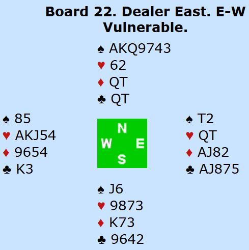 Alt er trist i dette spillet bortsett fra resultatet, +420. Utspillet ved begge bord er dårlig (men alle utspill kan jo være klaff), motspillene veldig svake, og skift til liten hjerter mot slutten er toppen på kransekaka. Øst bør se at han kan bli skviset, og hvis han spiller hjerter bør å spille damen være opplagt. Da holder vest hjerteren, og N/S går fortjent bet i den for hardt meldte utgangen.
