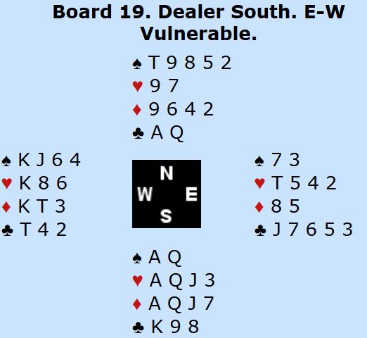 Den svenske nord la ned trumfesset. Men «safevarianten» i hjerter var ikke en safevariant i denne kontrakten idet det viste seg at det var to spartapere og en kløvertaper som sammen med den ene trumtaperen som kunne vært unngått ga en bet, Danmark +100.