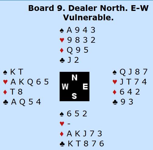 Ved nesten alle bord ble det spilt 4 hjerter som er en grei utgang, avhengig av kløverfinessen gjennom syd som åpnet med 1 ruter stort sett ved alle bord. Så meldt og vunnet +620 kan man ikke regne med å vinne noe på, det er vel alltid et buttspill? For hva kan gå galt for Ø/V her?