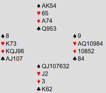 Løsning: Etter to runder trumf, spill ruter knekt som trumfes hos nord. Ett sparstikk må tapes uansett, så gi bort det stikket med liten fra begge hender. En av dem kommer inn og spiller spar tilbake til esset. Så trumfes den tredje sparen. Her er resten av kortene om det fra start sitter sånn som i vårt fullstendige diagram: