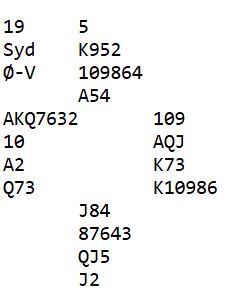 Et litt underlig meldingsforløp, det må det vel være lov å si? Men kløvertilpasning må Ø/V ha, og da har ikke syd mange kløvere! Meldingsforløpet påvirket nok Bogø som spilte ut kløver ess i håp om at en andre runde kløver ville bli trumfet av makkeren Geir Helgemo. Men det utspillet førte i stedet til at det ble enkelt spill for Thoresen: