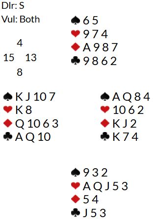 Hvis ikke spar ess kommer i utspill er det verre for da kan det bli en rutertaper og en hjertertaper. Å toppe ut hjerter dame er mot oddsen. Men hva skal øst spille ut? Hjerter 10 løser det problmet med en mulig hjertetaper ved å dekke med knekten, og finesse med åtteren senere.