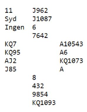 Et hverdagsspill som ville fort blitt glemt i lagkamp, Ø/V spiller 3NT hvor det bli minst ni stikk uansett hva som skjer. Så i lagkamp ville spillet blitt uavgjort, eller gitt +/- 1 eller 2 IMP til ett av lagene.
