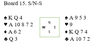 Mot Kjell Ove Helmersen (nord) og Lars Tore Langørgen fra Heimdal BK fikk vest som spillefører i 3 grand ruter 10 i utspill fra nord. Den ble stukket med kongen, og spillefører gikk i gang med å godspille hjerterfargen. Han måtte gi bort tre stikk der, og etter å ha gjort det arbeidet visste spillefører at nord satt med knekten dobbel i hjerter fra start, syd med K-Q tynt femte.