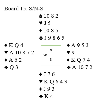 Spillefører måtte kaste kort fra øst idet han spilte god hjerteren, og etter hvert fikk han kastet alle østs kløver samt en spar han ikke trodde han hadde bruk for, og det ble etter det godspilte stikket for den femte hjerteren kun to ruter igjen hos øst, og det var den lekre finessekombinasjonen Q-7! Og det er vel bedre å spille på den finessen enn at sparfargen sitter 3-3? Spillefører tok sidestikkene siden inkludert kløver ess. Med to kort igjen spilte han liten ruter fra vest og ba med stø røst om syveren fra øst, men da ramlet taket i hodet på han. Slik så hele spillet ut fra start: