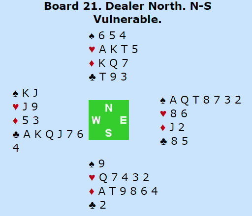 Det var på et vis rett å være med over den direkte sperremeldingen 4 spar, for i teorien er det en bet i 4 spar, mens 5 ruter og 5 hjerter står N/S. Den mest vanlige scoren var imidlertid +510 til Ø/V, tretten stikk i 4 spar etter kløver ut, i et spill hvor N/S altså kan ta fire motspillsstikk.