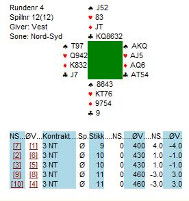 Meldingen var fort unnagjort og jeg var så heldig å få doblet makkers 3 kløver før jeg havna i 3NT. Rolv Sunde i Syd var lydig og serva etter tannlegens kommando en kløver.