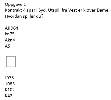 Det var ulikt nivå på disse oppgavene. Men selv de enkleste oppgavene har poeng som selv ganske erfarne spillere kan bomme på om det forekommer i praktisk bridge. Denne første var kanskje en av de enklere oppgavene, men med et poeng som mange turneringsspillere overser.