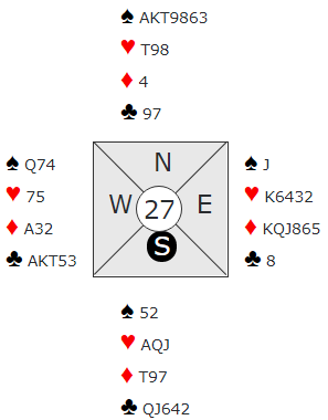 3NT er håpløst om motspillet finnes. Nord kan spille ut hjerter, spesielt hvis syd har doblet og dermed bedt om hjerterutspill (bordets først meldte/viste farge). Syd vinner første runde hjerter og spiller spar til nords konge. Så mer hjerter til syd og mer spar, denne gangen gjennom vests Q-x mot renons. Forsvaret får i så fall syv sparstikk og tre hjerterstikk, seks bet!