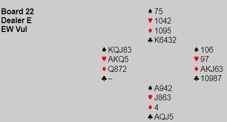 Nord spilte ut kløver, og da ble dette en nitrist kontrakt. Spillefører trumfet og spilte par. Syd lå unna første gang, stakk andre gang og fortsatte med kløver. Da ble spillefører kort og rar som man sier (i trumf), plutselig var syd lengst i trumf. Spillefører hadde kun ståstikk i de røde fargene, men syd hadde tatt over kontrollen. Spillefører kunne ikke nekte syd å få ett trumfstikk til og de hadde også flere kløverstikk å hente etter dette- Det endte med to bet og +200 til N/S.