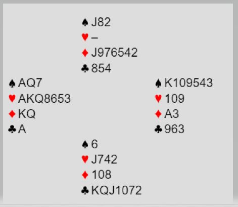 Både 7 spar og 7 hjerter er bra kontrakter. 7NT er også ok. Det er imidlertid en hake ved prosjektet 7 spar spilt av øst. Det kan komme hjerter ut til stjeling!