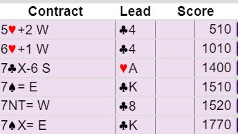 Ved det siste bordet doblet også nord 7 spar, men ved det bordet flyktet ikke vest til 7NT. Der hadde ikke syd meldt kløver. Så syd spilte ut kløver konge. Det var jo mer sannsynlig at nord var renons i kløver enn hjerter? Merk at vest hadde ikke meldt hjerter underveis. Så 7 spar doblet føk hjem, Ø/V +1770!