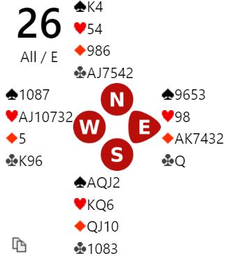 Det mangler litt HP for utgang N/S, men med sterk NT på den ene siden og en brukbar 6-3 tilpasning i minor endte det i 3NT stort sett over alt.