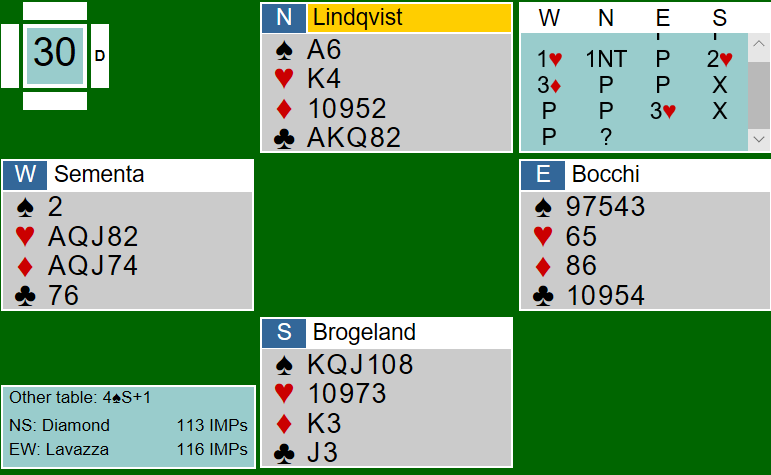Over syds sleminvitt gikk Lindqvist på og tok med seg en storeslemsinvitt som Brogeland avslo. De hadde funnet toppkontrakten 6 spar, og da slem ikke ble meldt ved det andre bordet var spillet verd 11 IMP. Ved det andre bordet åpnet Diamond med 4 ruter, også en god avgjørelse synes jeg, bedre melding enn Delmontes litt forsiktige 3 ruter.