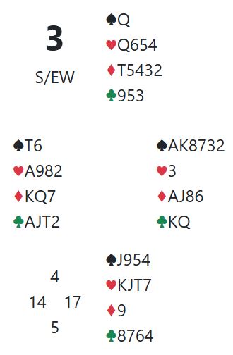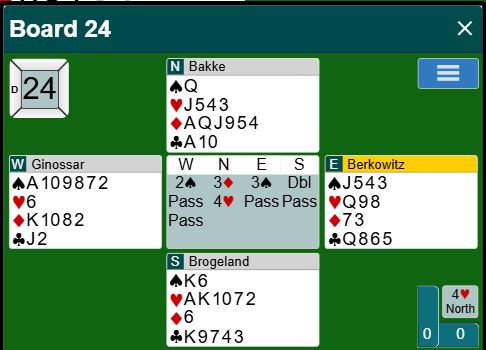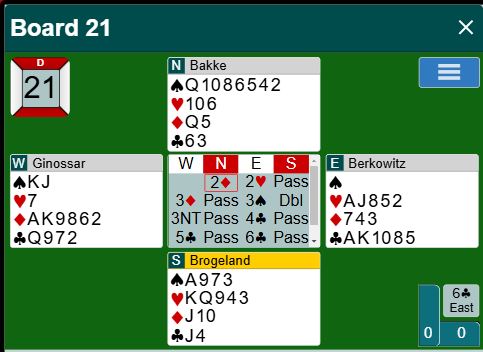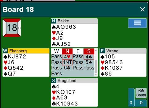 Bakke gikk for en nokså sikker utgang, mulig slem. Så han sa 2 spar over vests 1 spar, overmelding av motpartens farge. Det benekter lang ruter- eller hjerterfarge, og han har heller ikke firekorts hjerter siden han med det ville doblet negativt. Så 2 spar viser gode kort og kløverfarge, og de fleste bruker en sånn overmelding som minst invitt til utgang. Brogeland som ikke hadde vist kløverfarge med åpningen 1 kløver likte å høre at nord satt med kløverfarge, for da ble minimumshånden sterkere enn først antatt. Han sa 3 spar - antagelig avtalt som singelton. Bakke kunne liksom ikke gjøre noe annet enn å si 3NT over det, men Brogeland likte tanken på kløverkontrakt så godt at han tok ut i 4 kløver. Det fulgte noen cuebids før de havnet i 6 kløver som er en glimrende slem. Vest fant beste utspill, ruter. Men to runder kløver viste at det ikke var trumftaper. En ruter forsvant fra nord på hjerteren, og det var ingen problemer med å vinne alle tretten stikkene, N/S +1390. Om kløver dame hadde sittet tredje ville det selv etter det beste utspillet sett fra forsvarets side blitt vunnet slem om den med tre kløvere følger minst to ganger hjerter slik at spillefører rekker å bli kvitt en ruter fra nord.