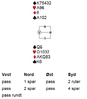Sett deg i nord med følgende blader. Du skal spille 4 spar, og øst spiller ut kløver-dama: