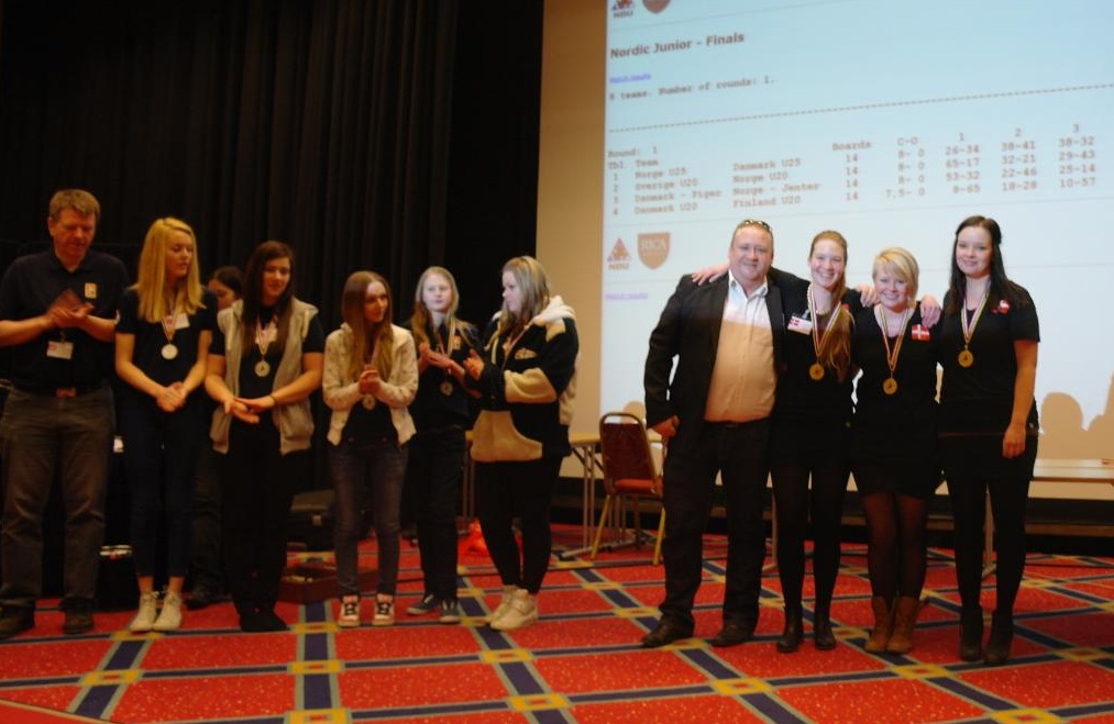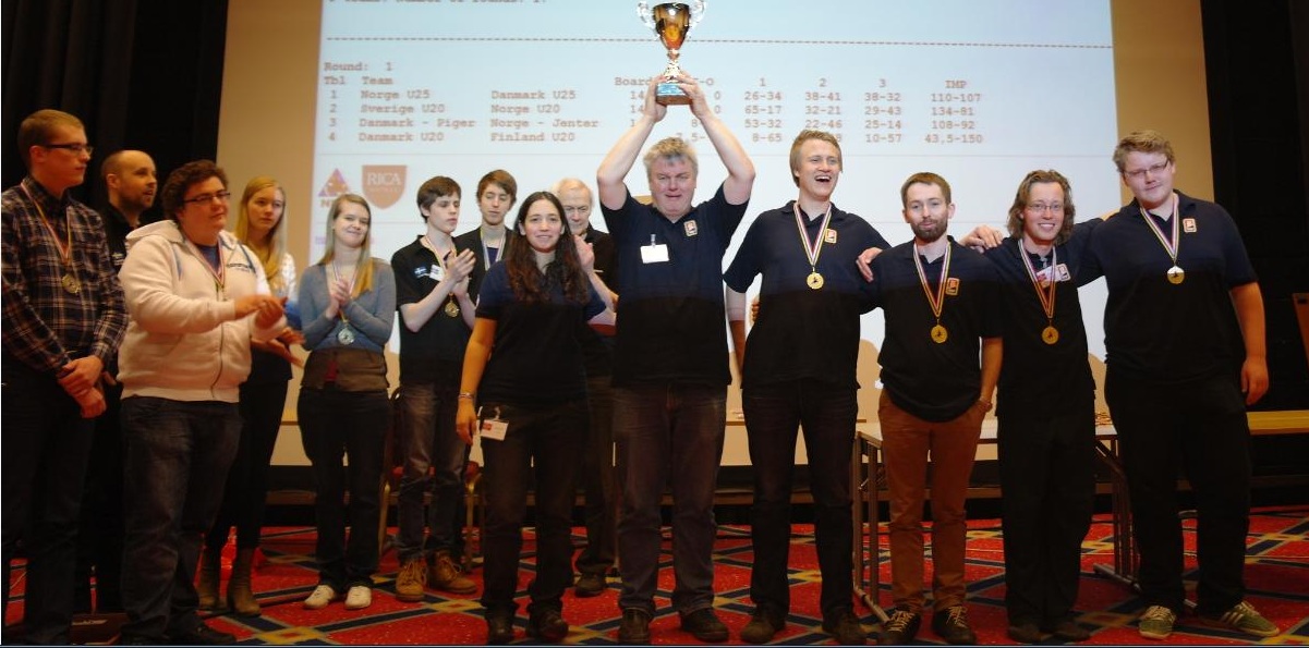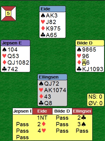 As you see, the biddings was the same on both table, except that Sweden stopped in 5 spade. If Eide choose to dbl 5 heart, it would have showed a hand with minimum, so now 5 spade from Eide made it easier for Ellingsen, because it looked like partner was short in heart, and he could raise to 6 spade. This kind of boards is decisive in short matches as here in the Nordic Championship.