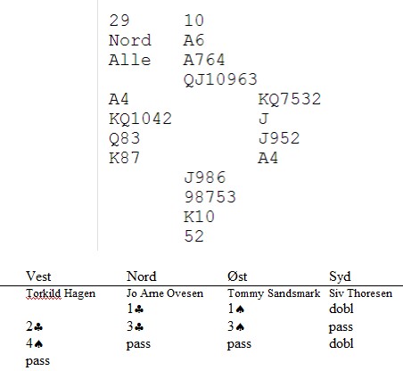 Nå tenkte nok Jo Arne sånn. "En makker som ikke spiller ut min farge, er renons der. Jeg ser ni kløvere og det er ikke helt underlig om øst har Exxx ". Han skifta til kløver for å gi Siv en stjeling og så for seg å komme inn på ruteresset i neste stikk og gi makker enda en stjeling. Det terrenget stemte ikke med kartet og kontrakten føyk hjem nå tre (!) ruter forsvant på bordets hjerter. +790 var alle poengene ØV.