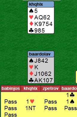 Øst åpner i 1 NT med pass rundt. Utspill Hjerter 10 til liten-liten og damen. Så spar til tier, liten kløver til damen, liten ruter til kongen, og liten ruter fra Thor Dag som spillefører ikke klarte å legge damen på. Resultat tre beit (!) etter en god lasj i utspill og underspilling av ruter E.