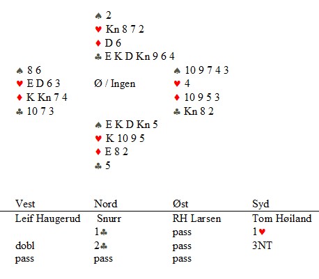 Som dere skjønte i går kveld var det en del tekniske utfordringer for turneringsledelsen, og av en eller annen grunn var poengscoren fra forrige tirsdag doblet for samtlige før vi spilte andre kvelden. Det betyr f.eks. at undertegnede, med beskjedne minus 17p fra forrige tirsdag startet med et utgangspunkt på minus 34 i går kveld. Rimeligvis falt dette heldig ut for Gerd som plutselig hadde 2 x 48 = 96p (!) før hun i det hele tatt hadde talt korta til første spill i går.