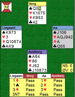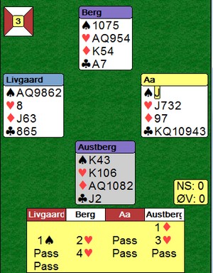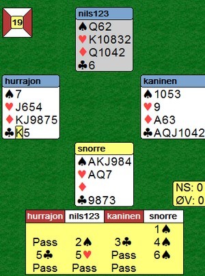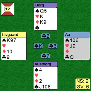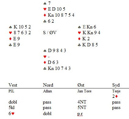 Det var mange interessante hender, hvorpå undertegnede og Ole har funnet ut at man må gjøre noen justeringer på systemet. Det er ofte man dukker opp i situasjoner som gjør ting vanskelig, disse situasjoneene burde man analysere, samt se om det er noe man kan gjøre for å ta tak i dem. Jeg har hele tiden sagt at man ikke må diskutere posser basert på hender, dvs akkurat den hånda man har forran seg osv. Det man derimot kan diskutere/justere er situasjoner som oppstår, dvs når motparten melder inn det eller det, eller når man sitter å spiller et motspill, ikke analyser det ene spillet alene, men diskuter hva de forskjellige kastene skal vise. Igjen på et generellt nivå, ikke HÅND FOR HÅND.