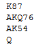 Etter ruter 10 i utspill hvor jeg ikke fikk klar informasjon, hjerter til min konge i stikk 2, deretter mere hjerter fra meg var 5-korts sluttposisjonen denne etter at spillefører hadde cashet sine 5 ruterstikk og et hjerterstikk til denne: