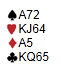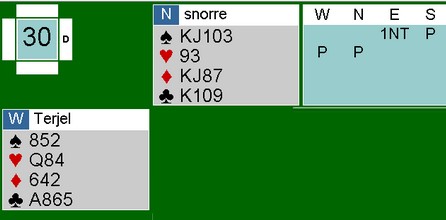 Jeg kan ikke spille spar eller hjerter fordi da rekker øst å godspille den trettende sparen og har får to i spar, tre i hjerter og de to minoressene. Derfor må jeg spille kløver for å sette opp et stikk der før spartassen er godspilt. Det klarte jeg.. MEN ØST HAR JO BARE EN KLØVER IGJEN OG HVIS DET ER DAMEN MÅ JEG SPILLE KONGEN!! Det klarte jeg ikke!!!