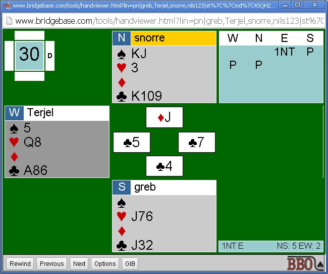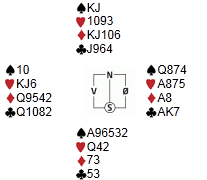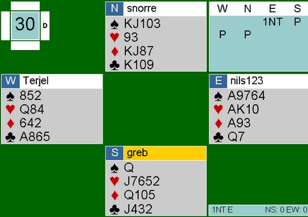 Svein Ove kunne med åpne kort gjort det enklere for seg selv i dette spillet, men det er jo artigere når det presser seg fram med en skvis. Som sør åpna jeg med 2 spar, som kan være både 5 og 6korts, svak, og etter litt frem og tilbake fant Svein Ove i øst ut at han skulle spille 3NT: