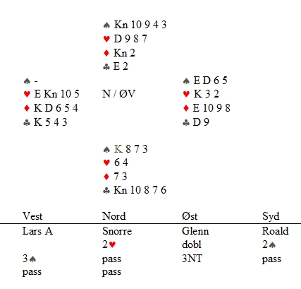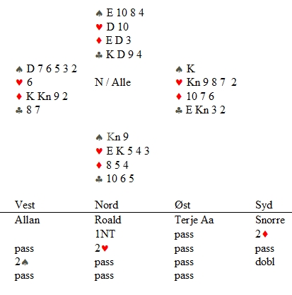 De fleste innenderne var enige i at dobler var opplagt etterpå, selv i lag. Det er ikke straff, men viser maks for passen og lar makker bestemme. Denne gangen ble det 500 fine inn mot beit i 3NT på det andre bordet. |