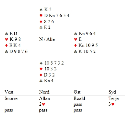 Jeg skal ikke argumentere lenge for passen, men det er viktig å ta med slike spill i diskusjonen om hvorfor vi ikke kom i en annen hard utgang. (som sto). Hadde jeg hatt f.eks Kx i spar og EKn109x i hjerter, er det mer opplagt å invitere. Da vil hjerteren oftere gi minst fire stikk, pluss at sparkongen er et mulig inntak eller stikk. Med EKxxx og ikke noe inntak, er en fort avhengig av 3-3 sits i hjerter. Husk at makker melder noe annet enn 2hj med maks når han har støtte.