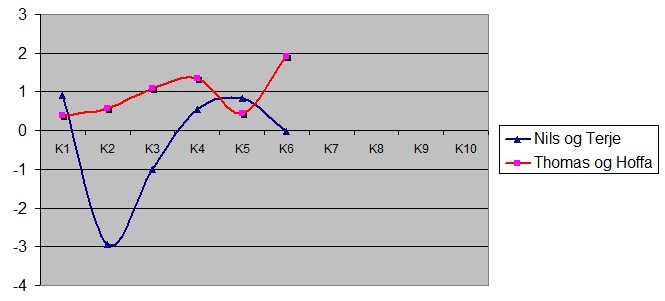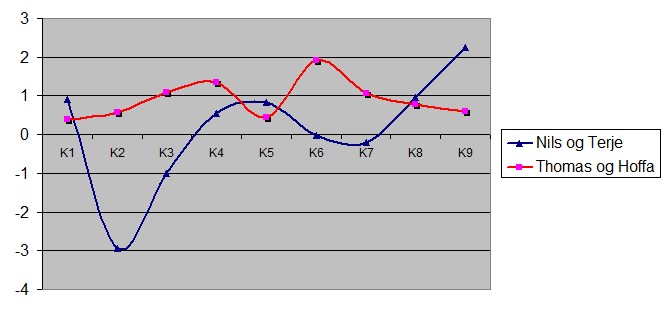 Jeg overhørte Allan Livgård i samtale med makker Terje Aa da de var i ferd med å avslutte kveldens sosiale sammenkomst. "Får vi poeng i nest siste kampen, Terje, så speller du fort som faaen sånn at vi unngår straffepoeng. Da blir det skive å henge rundt halsen i morgen kveld!" |