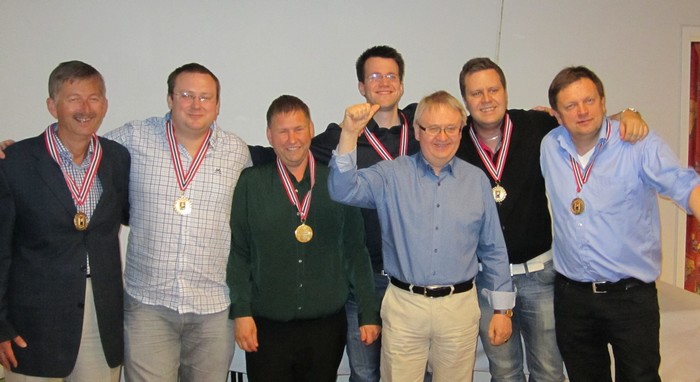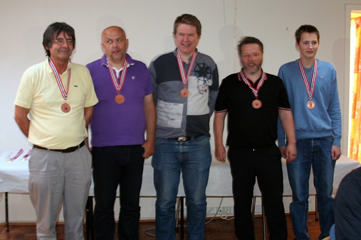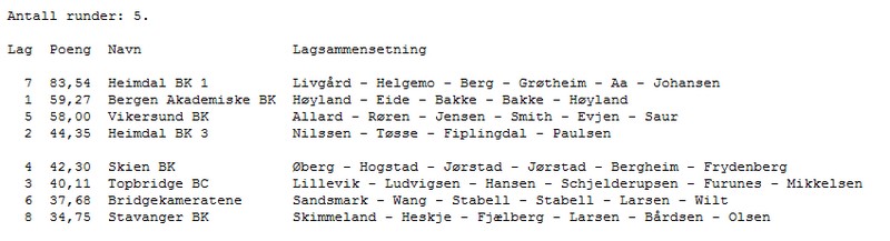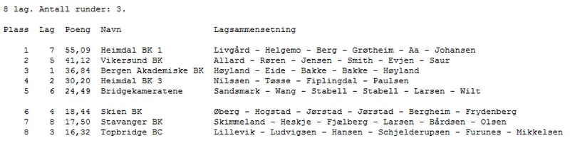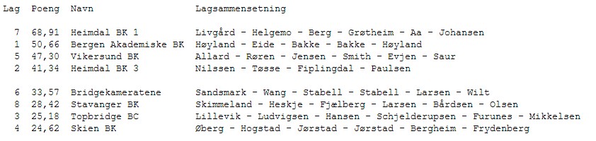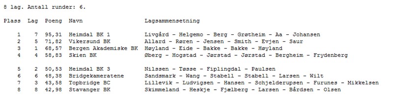 Det har vært klart lenge at seieren ville gå til Heimdal. De gikk ubeseiret gjennom mesterskapet, noe som sikkert har skjedd før, men er langt fra vanlig. Rett og slett verdige mestre. På andreplass kom Vikersund. Gledelig! En gjeng med joviale og muntre gutter som spiller god bridge. De bruker kanskje ikke 4kl og 4sp som Blackwood, men det viser seg gang på gang at det holder meg sunn fornuft og godt gammeldags bondevett. Bronse til Høyland fra Bergen, heller ingen bombe.
