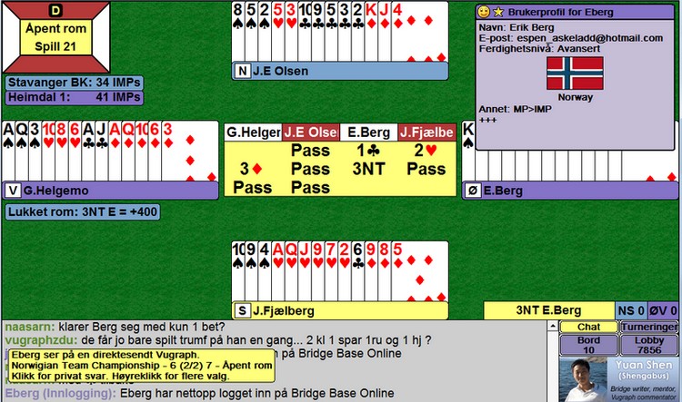 Hittil har jeg formidlet med høy saklighetsfaktor fra NM bridge, men Helge Stornes og kaninen har savnet vitsene mine. Jeg begynte frisk med en anekdote om Heimdal og Titanic, før dere fikk en engelskleksjon av BBO-operatøren . Midt under den sjette BBO kampen mellom Heimdal og Stavanger, med Erik Berg live for hele verden, logga han seg plutselig på som bakspiller. Ikke rart gutta vinner!!