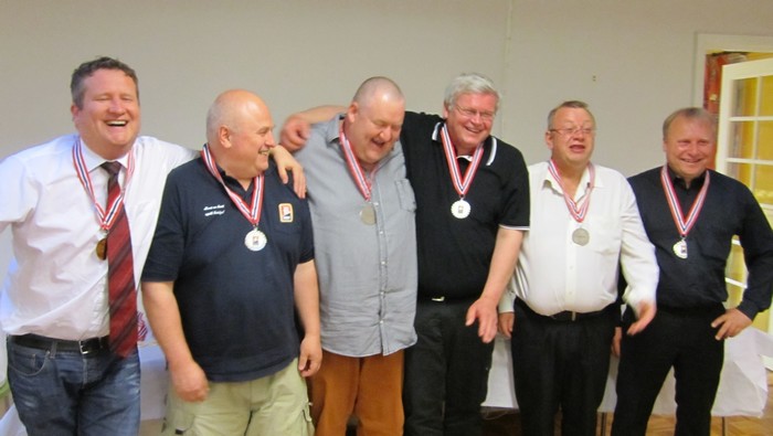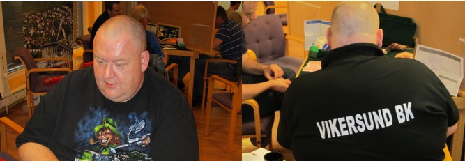 Jeg overhørte Allan Livgård i samtale med makker Terje Aa da de var i ferd med å avslutte kveldens sosiale sammenkomst. "Får vi poeng i nest siste kampen, Terje, så speller du fort som faaen sånn at vi unngår straffepoeng. Da blir det skive å henge rundt halsen i morgen kveld!" |